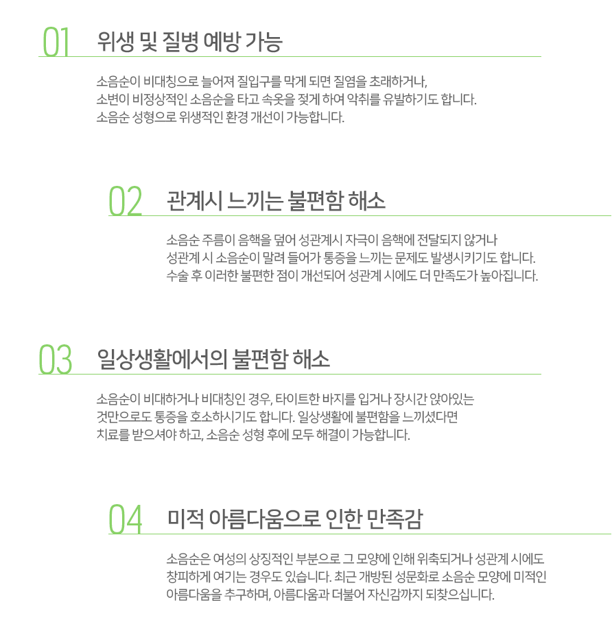 비정상적인 소음순은 일상생활에서 걷거나 앉는 것에 불편함을 주기도 하고 지나치게 질을 막고 있어 분비물 배출이 어려워져 비위생적인 환경을 만들기도 합니다. 특히 최근에는 개방된 성문화와 더불어 미용상의 이유로 소음순의 모양을 중요하게 생각해 소음순의 모양이 마음에 들지 않아 위축감 또는 자신감이 결여되기도 합니다.